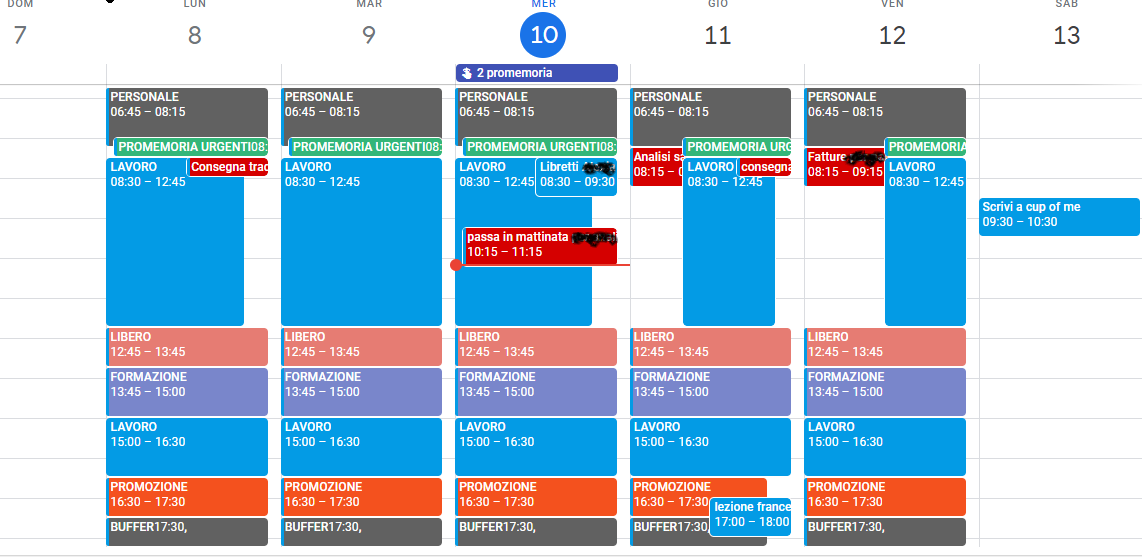 Qui sotto un esempio di quello che ho ottenuto della mia settimana con il sistema di organizzazione a fasce. Google Calendar tra l’altro si sincronizza anche con il calendario sul cellulare e anche con il Google Home di casa. Ogni mattina basta che dica “buongiorno Google” per avere una panoramica degli appuntamenti urgenti che mi sono prefissata e delle fasce che mi attendono.