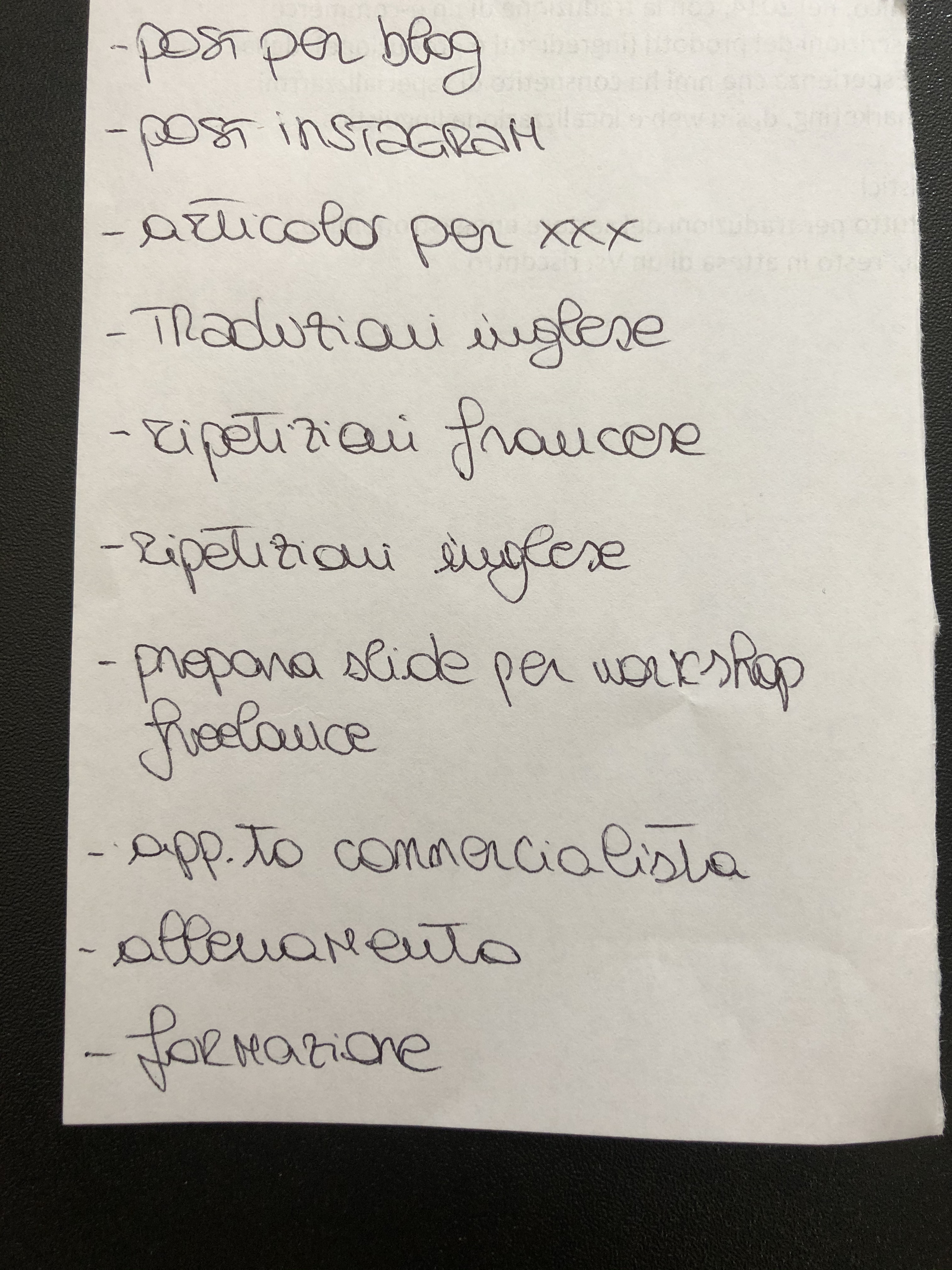 Cosa ho indicato nella lista “formazione”? Tutto ciò che riguarda la formazione e quindi corsi e/o webinar ai quali mi sono iscritta, o che ho intenzione di frequentare. La lista “lavoro” cambia a seconda dei vari incarichi che ho al momento. Questa lista è ulteriormente suddivisa per giorni perchè ci sono giornate specifiche nelle quali ho sempre gli stessi compiti (ad es. quando devo preparare la tazzina linguistica che pubblico due volte a settimana su Instagram, il post sul blog che esce ogni giovedì oppure la “cup of me”- con le mie confessioni e riflessioni semi privati e semi serie- del sabato, sempre su Instagram).
