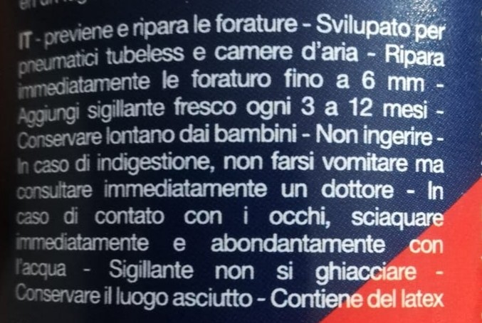 Nel leggerla mi sono fatta due risate. Tralasciando gli orrori di ortografia (che come sapete da un precedente post mi fanno gelare il sangue nelle vene) come “svilupato per”, “ripara le foraturo” e “sigillante non si ghiacciare”, mi ha fatta veramente morire dal ridere questa frase: